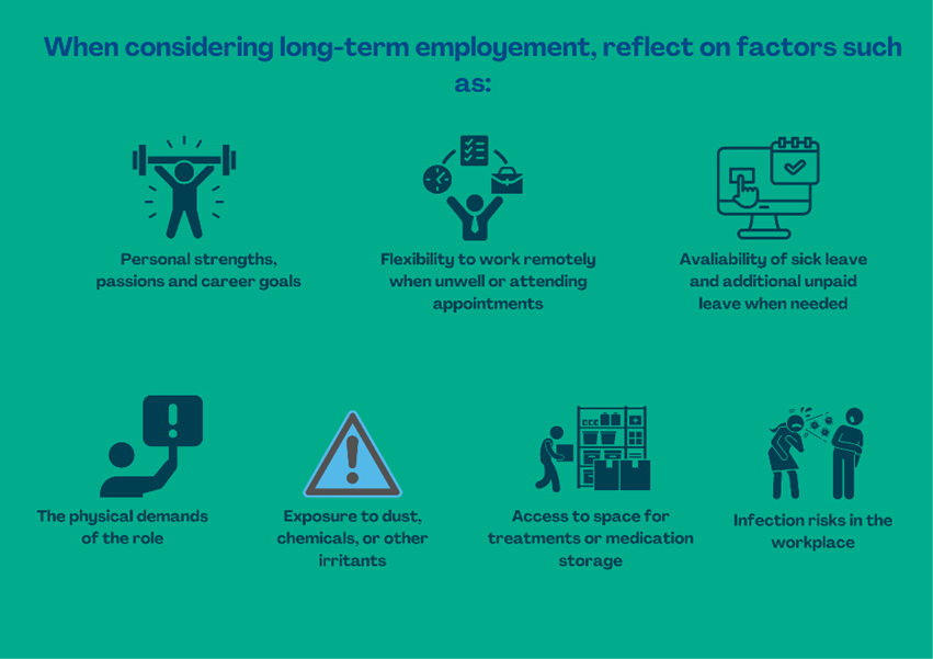 Having more career opportunities is a great step forward for people with CF, but it’s important to consider your health needs. Choosing flexible work arrangements and roles that support your wellbeing can help you stay meaningfully involved in the workforce. Research shows that roughly 67 % of adults with CF in Western Australia are in paid employment, though many report their health impacts work attendance or performance. These findings highlight the importance of flexibility and planning in employment for adults with CF.