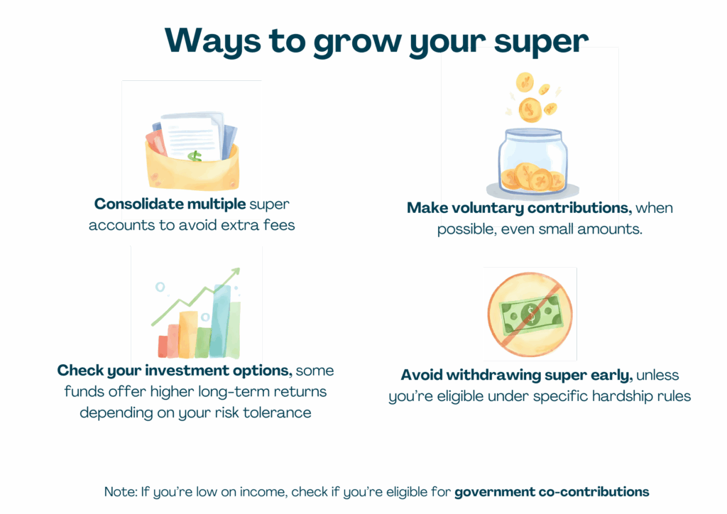 - If your income is low, you may be eligible for government help to boost your super. Check your eligibility on the ATO website.