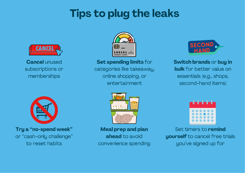 Spending leaks are usually small, regular costs that seem harmless on their own but can drain your finances when added together over weeks or months without you noticing. It is important to identify common spending leaks and try to reduce or eliminate them.